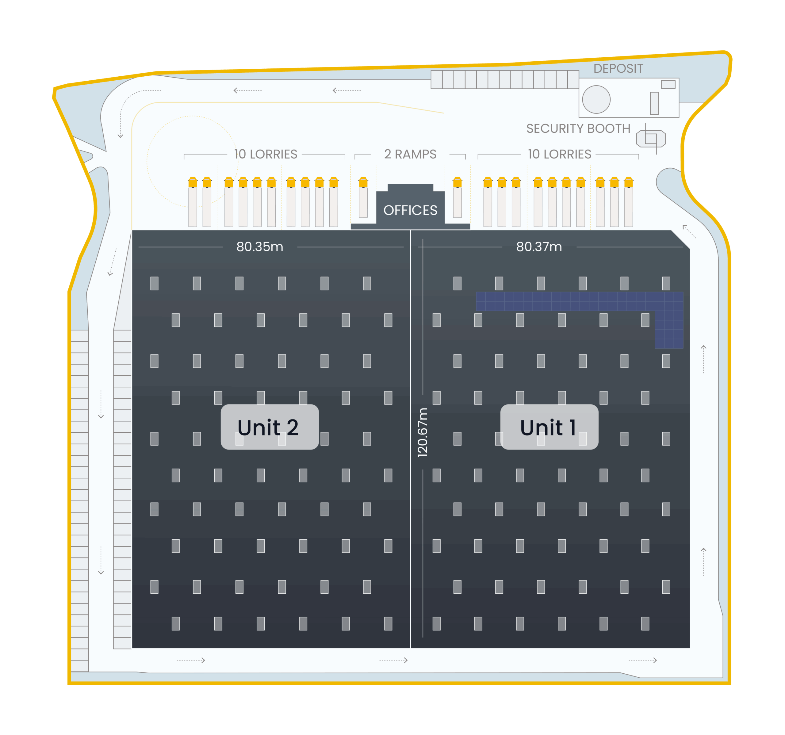 With a plot area of ​​33,410 m² and 1,000 m² of office space, the two warehouses guarantee maximum operational capacity for warehousing activities and last-mile delivery procedures.